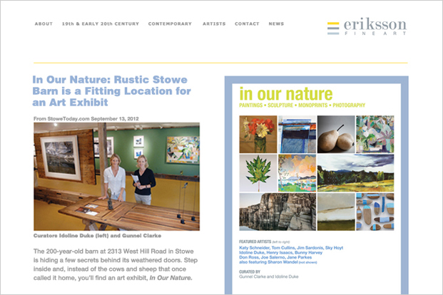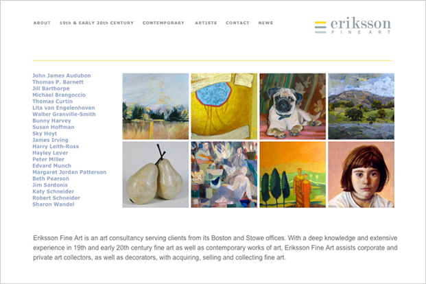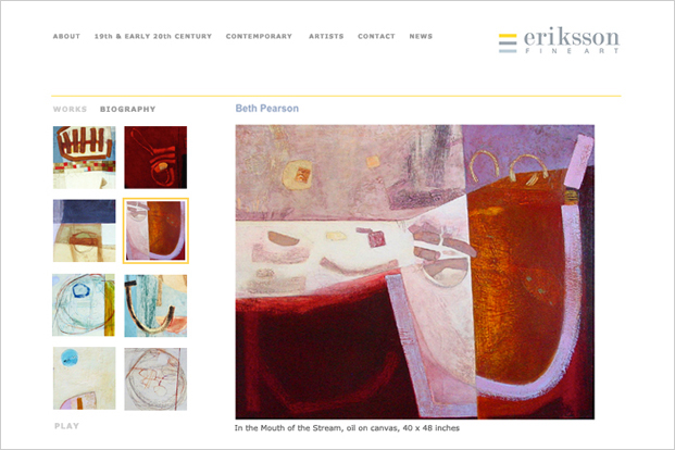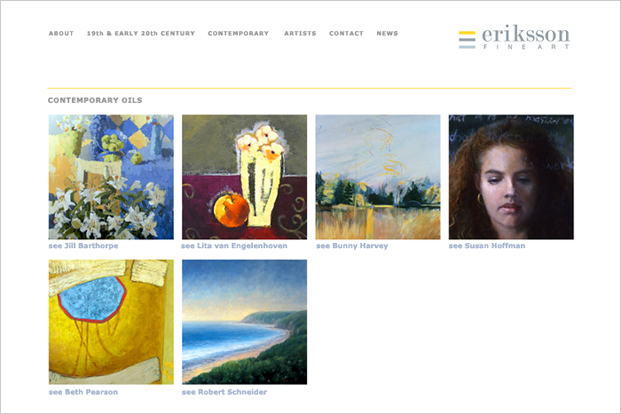 Online gallery of artists represented by Eriksson Fine Art, a consulting service for corporations, private collectors, and interior designers.