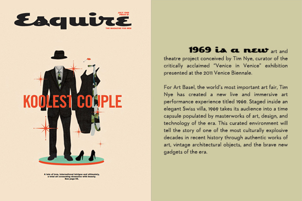 Illustrated prospectus for an exhibition and art performance conceived for Art Basel, Switzerland 2013. Staged inside an elegant Swiss villa, 1969 creates an immersive environment of art, vintage interiors, and brave new gadgets of the 1960s. Guests step inside the intriguing world of two fictional characters, Walter and Vivian Koolhaus.