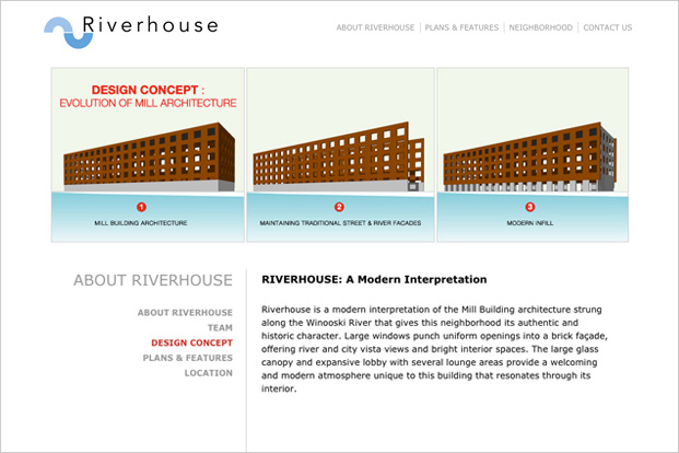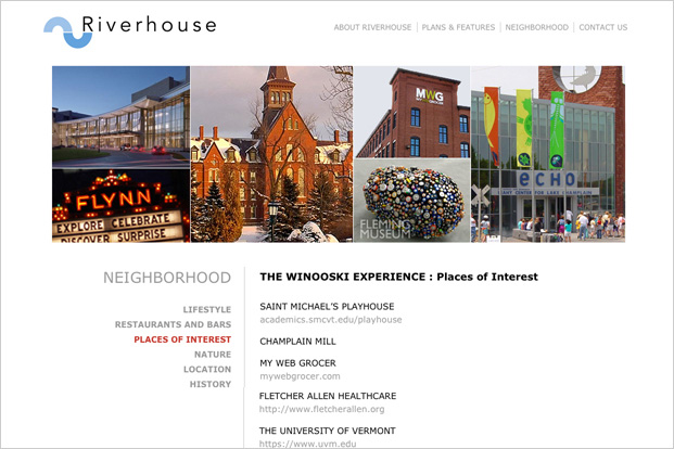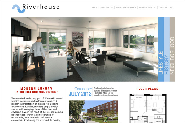 DESCRIPTION Expansive website promoting newly renovated luxury apartments in the historic mill district near Burlington, Vermont. Designed to convey a casually elegant lifestyle and spirit of urban renewal.