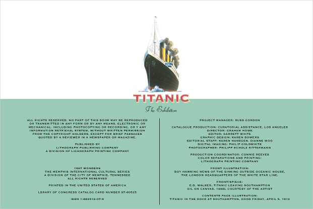 222-page catalogue from the exhibition displaying over 400 items from the seabed wreck. Includes a photographic and illustrated history of the Titanic and the efforts to recover it from the seafloor.